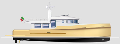 The Necton 55 Line includes two vessels of the same lenght but widely different characteristics. One is a full displacement trawler (steel construction) suitable for long distance cruising at any latitude in comfort. The other one is a very efficent cruising powerboat of aluminium construction, designed for higher speeds with limited power and fuel consumption. Both extremely safe and comfortable. Thanks to the construction process the owner can totally customize internal layout and various other features of these vessels. |